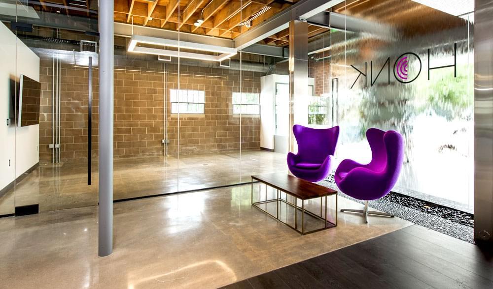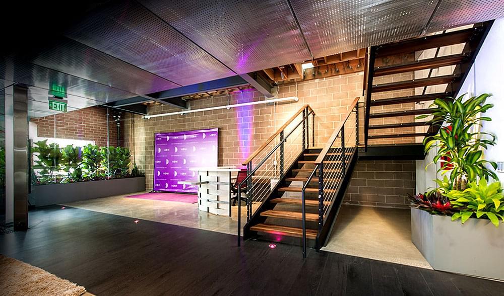 Twelve-foot high exposed ceilings on both floors create an open and spacious feel. The front of the building features cut-outs containing greenery that give the building a great indoor/outdoor feel. Upon entering the property, visitors are greeted with a ceiling-high water feature, which has become an HQ trademark. A clerestory on the second floor floods the space with light, along with the many skylights and windows. A 28-space private parking lot just across the street allows its users to easily park and walk into the front door of the property. The outdoor garden at the rear of the building features several seating areas, a barbeque area, and beautiful greenery.
