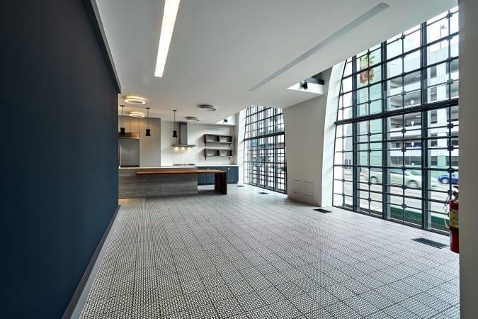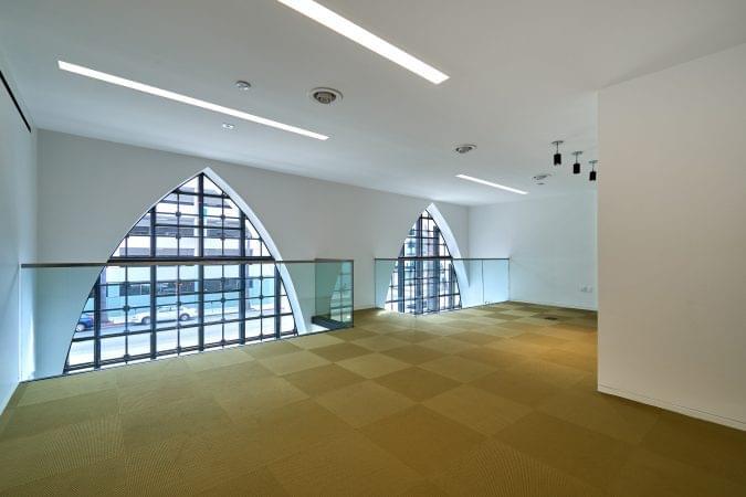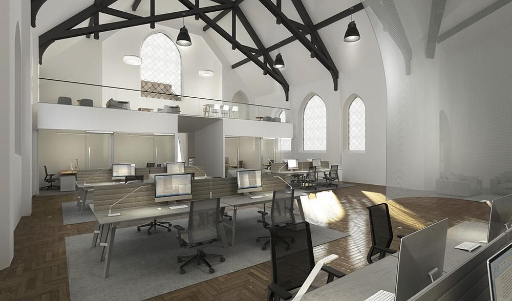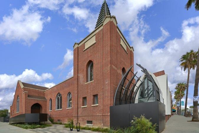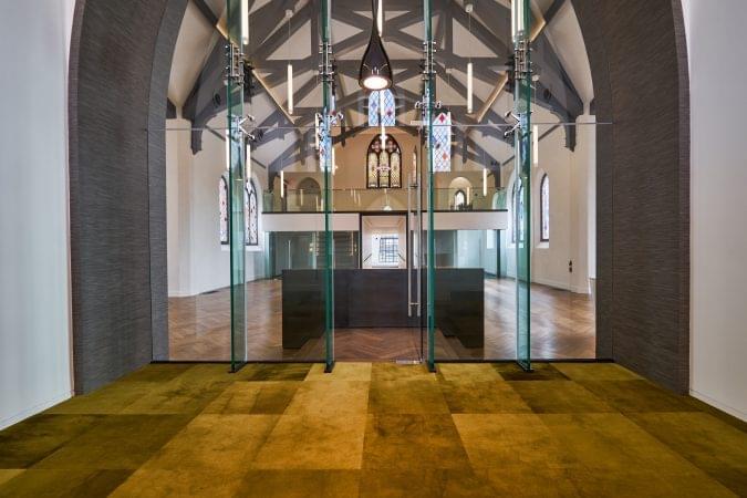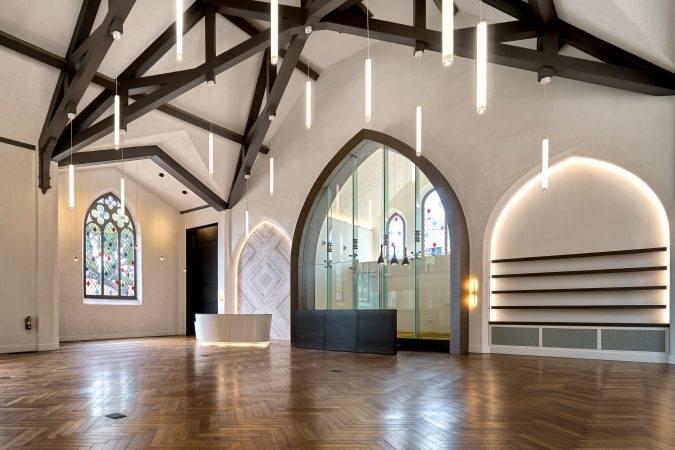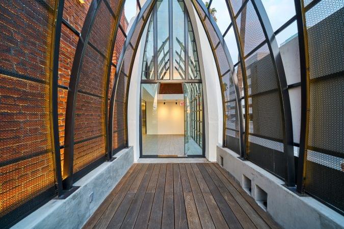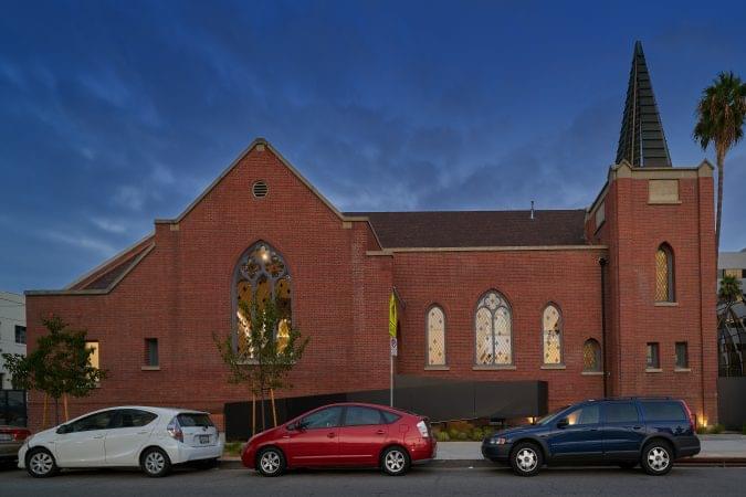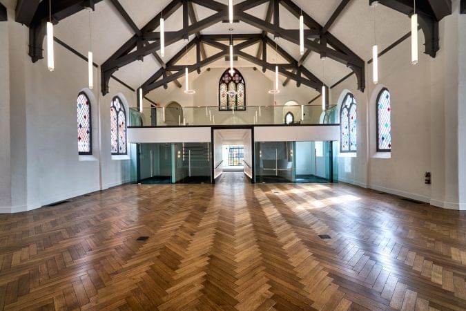 4975 Sunset is a church transformed into a high-end creative office building. It features 30-foot ceiling heights, a full kitchen, and a mezzanine area overlooking the vast open space.