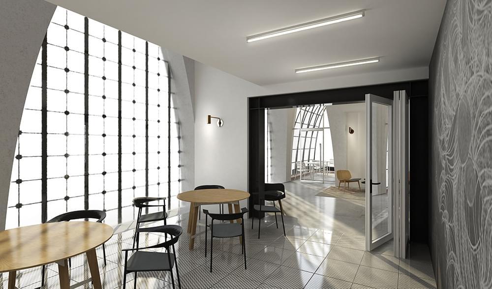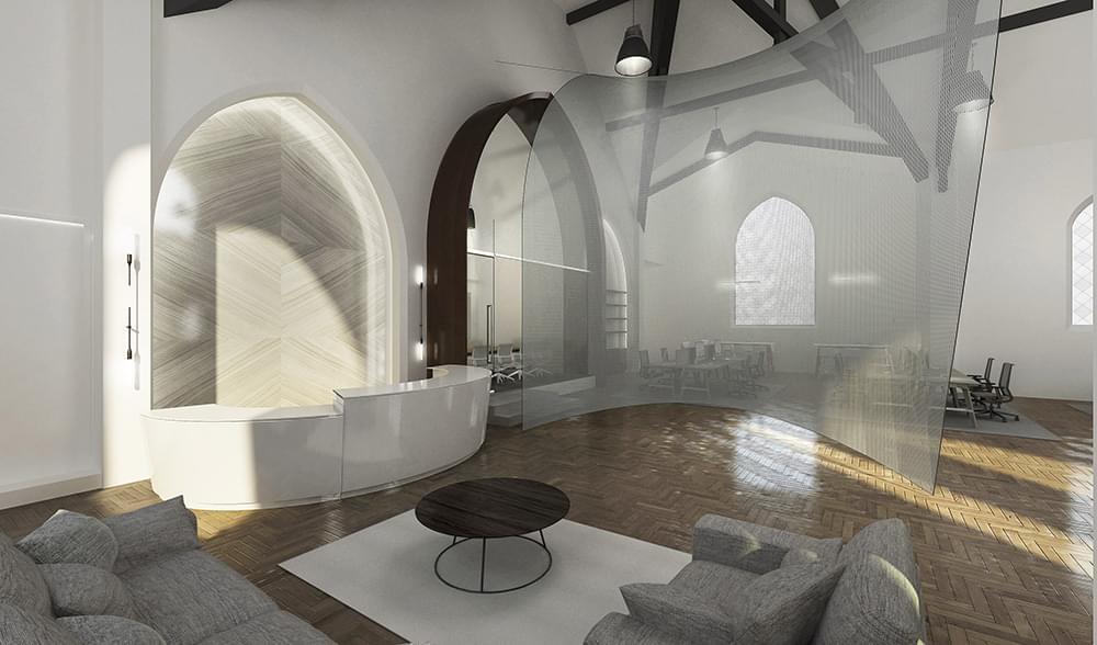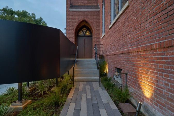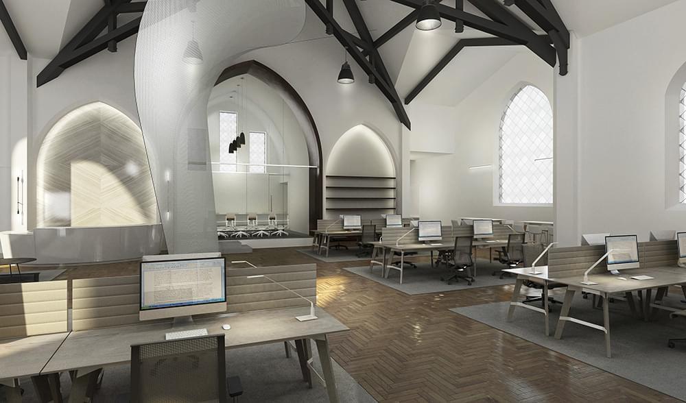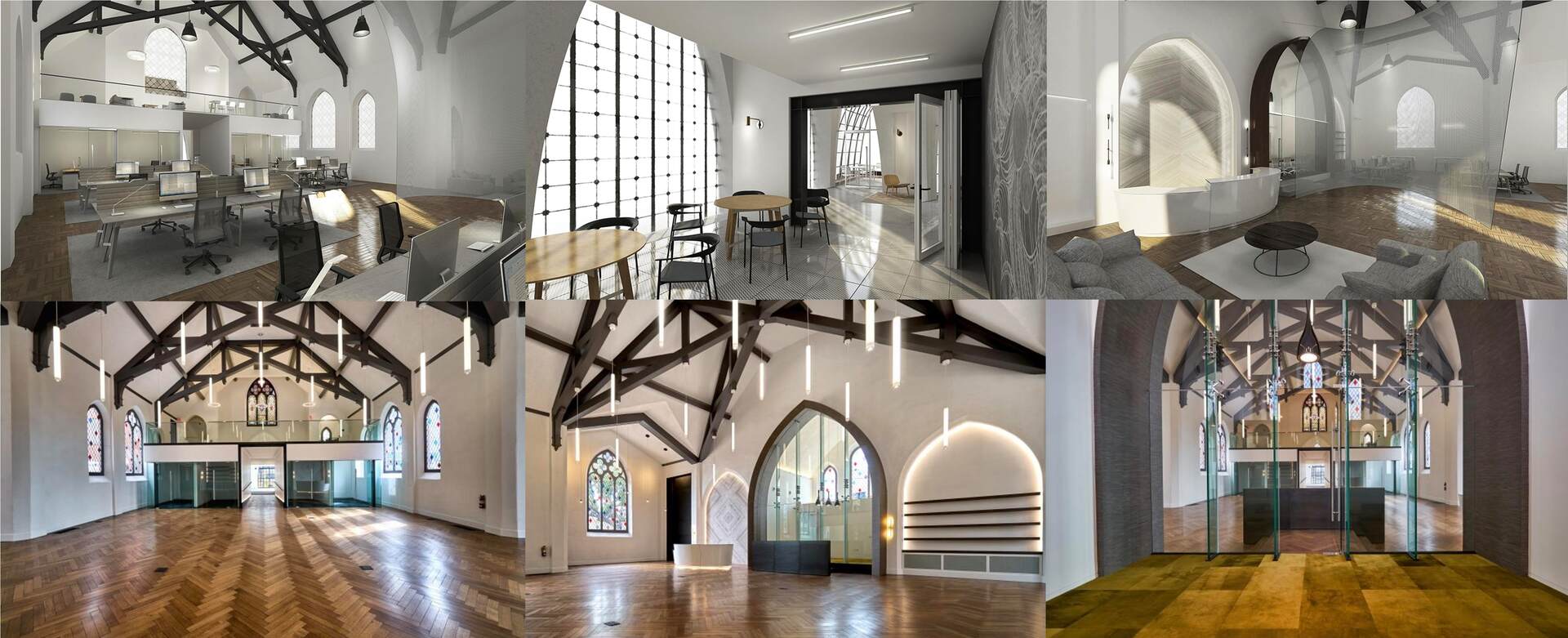 4975 Sunset is a church transformed into a high-end creative office building. It features 30-foot ceiling heights, a full kitchen, and a mezzanine area overlooking the vast open space.